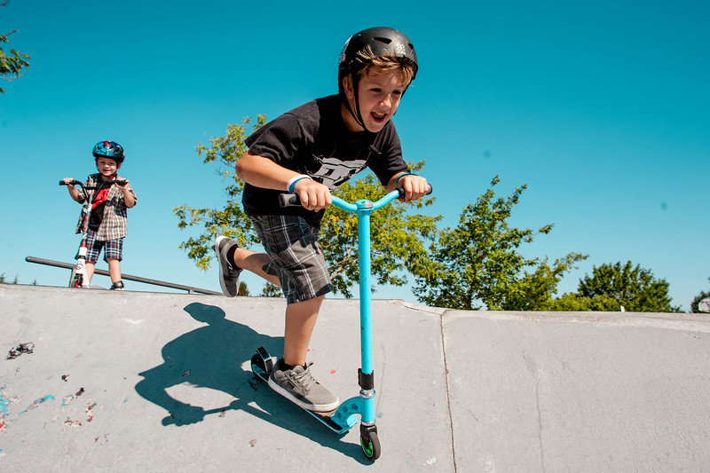 We spent forty-five minutes together one Saturday morning. Two boys, two helmets, two parents, the four (collective) wheels, and me. The Murrayville Skateboard Park at W.C. Blair Recreation Centre in Langley was deserted at 9am on a steaming hot morning, so I got to watch all the tricks as many times as I wanted to. And – boy oh boy – were there tricks!